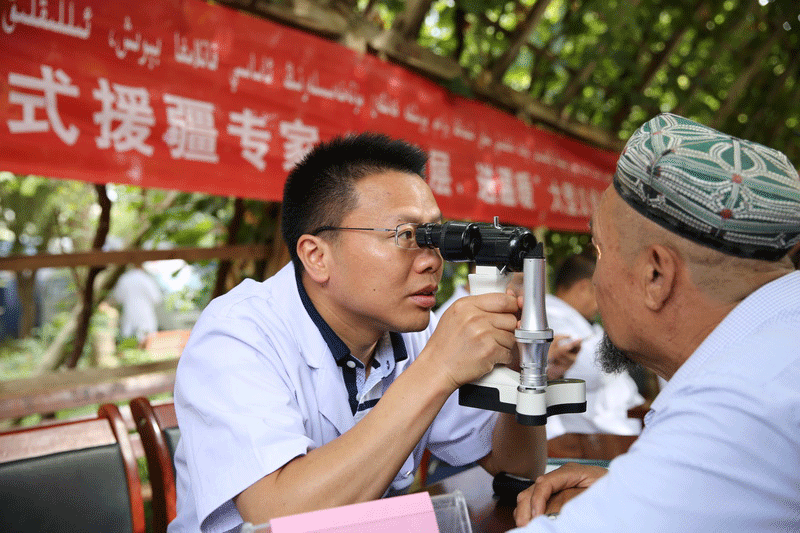 图为眼科援疆专家李修义副主任为职工检查眼睛