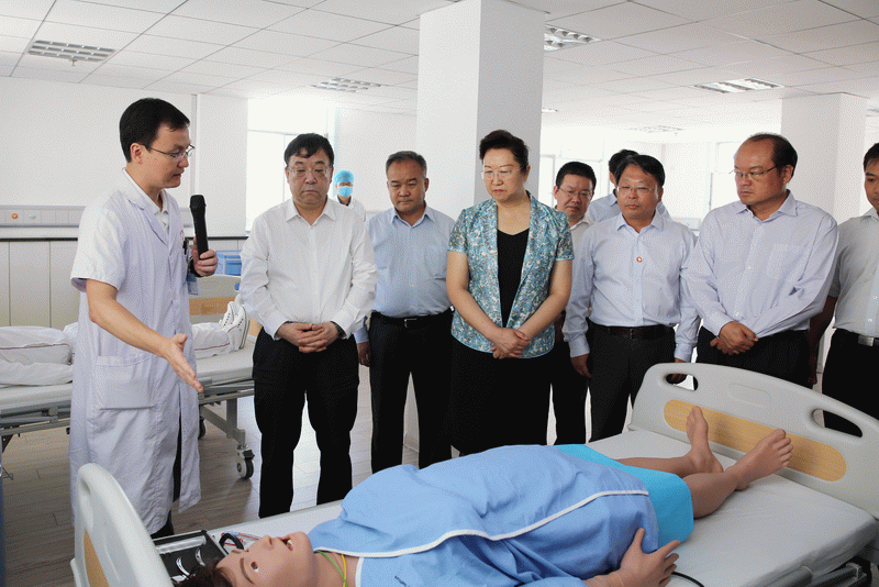 图为援疆专家、副院长张雄博士(左一)在向自治区党委常委、组织部部长马学军(左二)、自治区人民政府副主席田文(左四),以及师市等领导介绍高仿真智能生理模拟人的功能