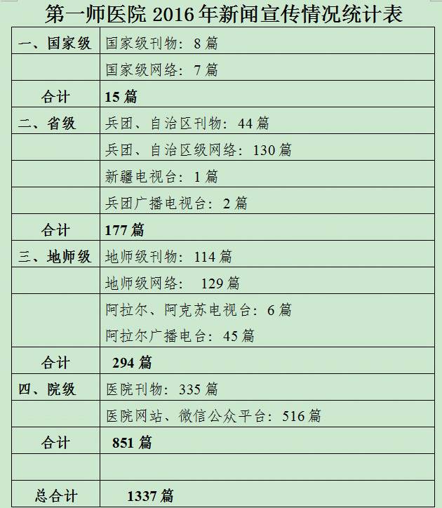 回顾2016,是极为不平凡的一年,是第一师医院突飞猛进、快速发展的一年。 这一年,第一师医院荣获了全国“节约型公共机构示范”单位称号,晋升为“三级甲等”医院,迎来了首批“组团式”援疆工作,提升了核心竞争力,落实了“以病人为中心”的服务理念,提高了医疗质量和服务能力,确定了兵团“南疆区域医疗中心”的地位。 这一年,第一师医院的新闻宣传工作着力构建大新闻宣传格局,紧紧围绕医院的中心工作抓亮点、推精品、创品牌,唱响主旋律,打好主动仗,充分发挥各级各类新闻媒体、医院门户网站和微信公众平台的作用,多角度、多层次的开展内、外宣传工作,各种创意性的策划和宣传层出不穷,及时客观地反映了医院的医疗技术、科研成果、先进经验、文化建设以及医务人员的精神风貌等,积极宣传党的路线、方针和政策;宣传先进典型和事迹;宣传医院的新技术、新项目、新疗法等等,传播正能量,树立新风尚,不断扩大内外宣传影响力,营造良好的社会氛围,新闻宣传工作呈现良好态势,既树立了医院形象,又提升了医院美誉度,为医院的发展创造了良好的舆论氛围,开创了第一师医院新闻宣传工作的新局面。 盘点2016年,第一师医院在各级各类报刊杂志、广播电视、网络媒体刊发新闻稿件和信息1337篇(条)。 在国家级报刊杂志和网络媒体上刊发稿件15条; 在省级报刊杂志和网络媒体上刊发稿件177条; 在地师级报刊杂志和网络媒体上刊发稿件294条; 在医院网站和微信公众平台同步刊发各类信息516条; 组织编印《“组团式”援疆工作简报》32期,刊发信息335条; 编印宣传册3本; 拍摄电视专题片3部; 制作各类宣传版面117块; 在新的一年里,第一师医院将认真总结经验,进一步强化措施,以科学发展观为指导,进一步坚定政治立场,把握舆论导向,充分发挥新闻宣传工作特有的敏感性,捕捉新闻瞬间,写出时效性强、质量高的新闻稿件,提高工作效率,及时宣传和报道好医院的工作动态、先进事迹、优质服务、文明新风等,鼓足干劲,与时俱进,努力开创新闻宣传工作新局面,做出新成绩、新贡献,为促进医院健康、持续、快速发展提供良好的舆论环境。
