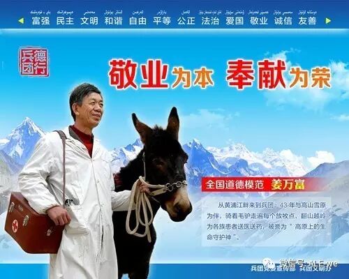 引言:根据中宣部、中央文明办和兵团文明委的工作安排,为进一步培育和践行社会主义核心价值观,学习宣传道德模范的先进事迹,营造崇德向善、见贤思齐、德行天下的浓厚社会氛围,经兵团领导批准,设计制作以"德行兵团"为主题、以兵团道德模范和全国文明家庭为原型的社会主义核心价值观公益广告,在兵团广泛张贴刊播。 “新疆兵团第一师医院”微信平台 陆续刊发16位典型人物的公益广告。 今天刊登 “全国道德模范” 姜万富。